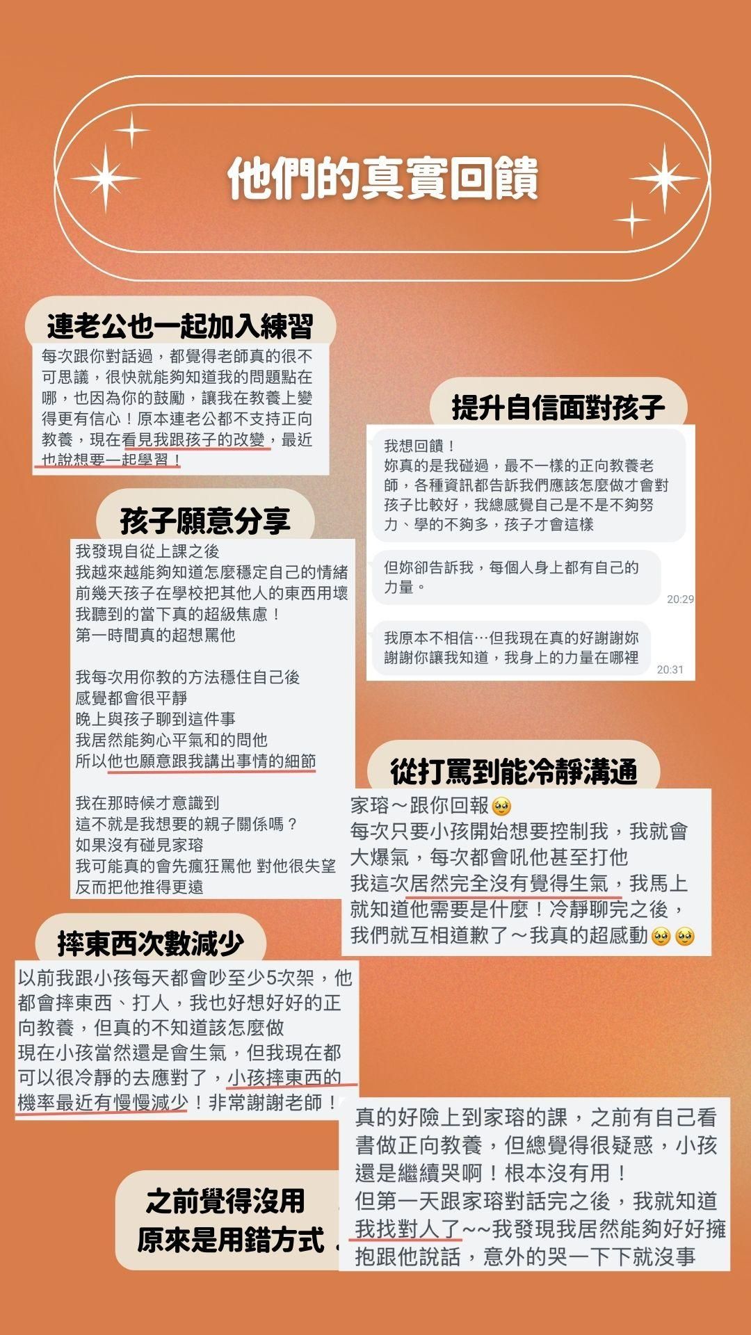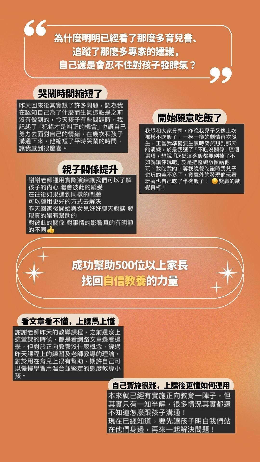 問題的核心不在於技巧不夠,而在於大部分教養課程都只告訴你「怎麼說」,卻很少告訴你「說了之後怎麼辦」。這門課的獨特價值在於,它不只教你技巧,更重要的是幫你建立正確的心態。市面上的課程大多假設孩子會配合你的技巧,但這門課會告訴你真相:當你做對了所有事情,孩子還是會哭鬧,而你需要學會的是如何在孩子不聽話時依然能穩定自己,如何在衝突中依然保持與孩子的真實連結。