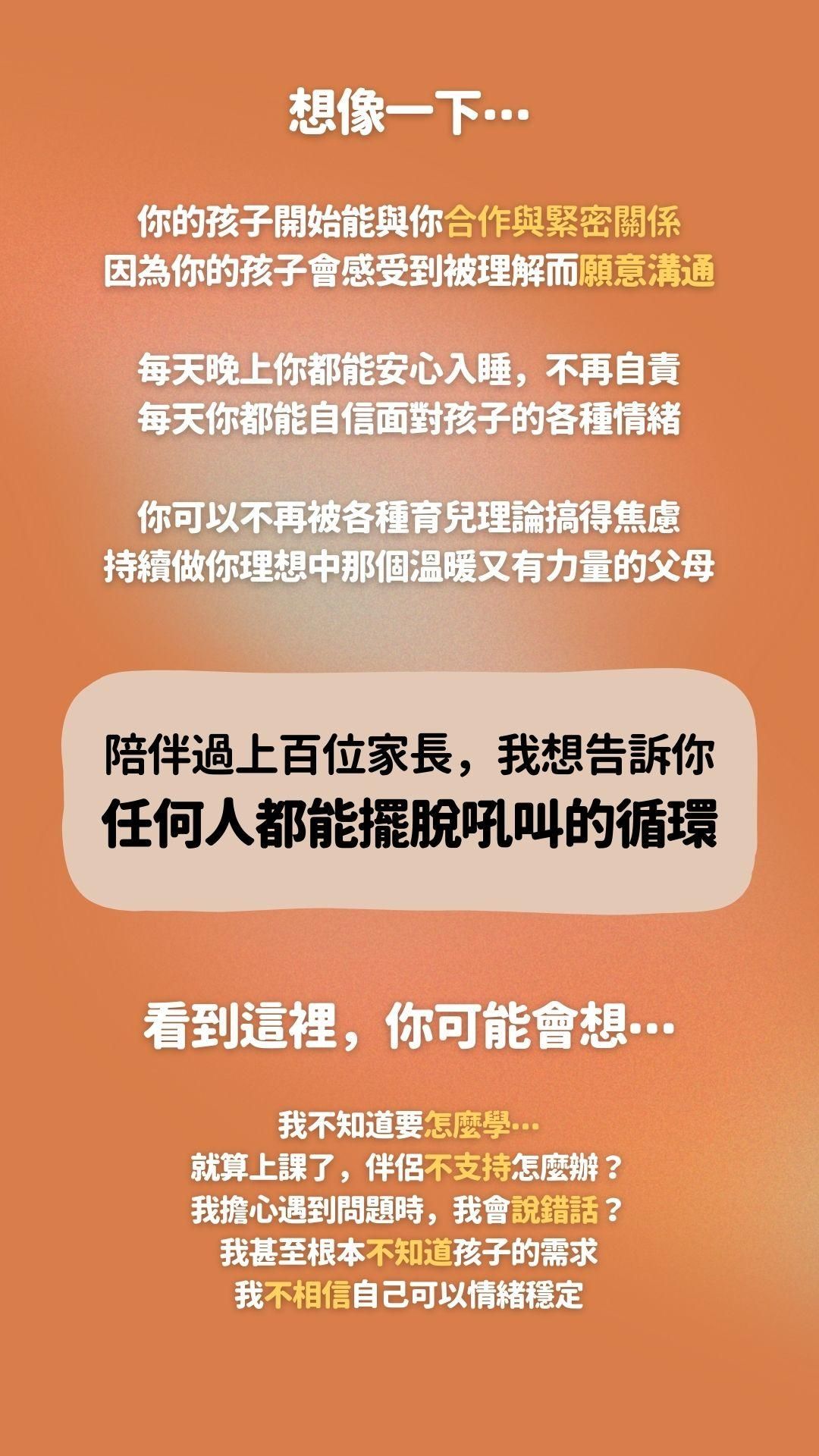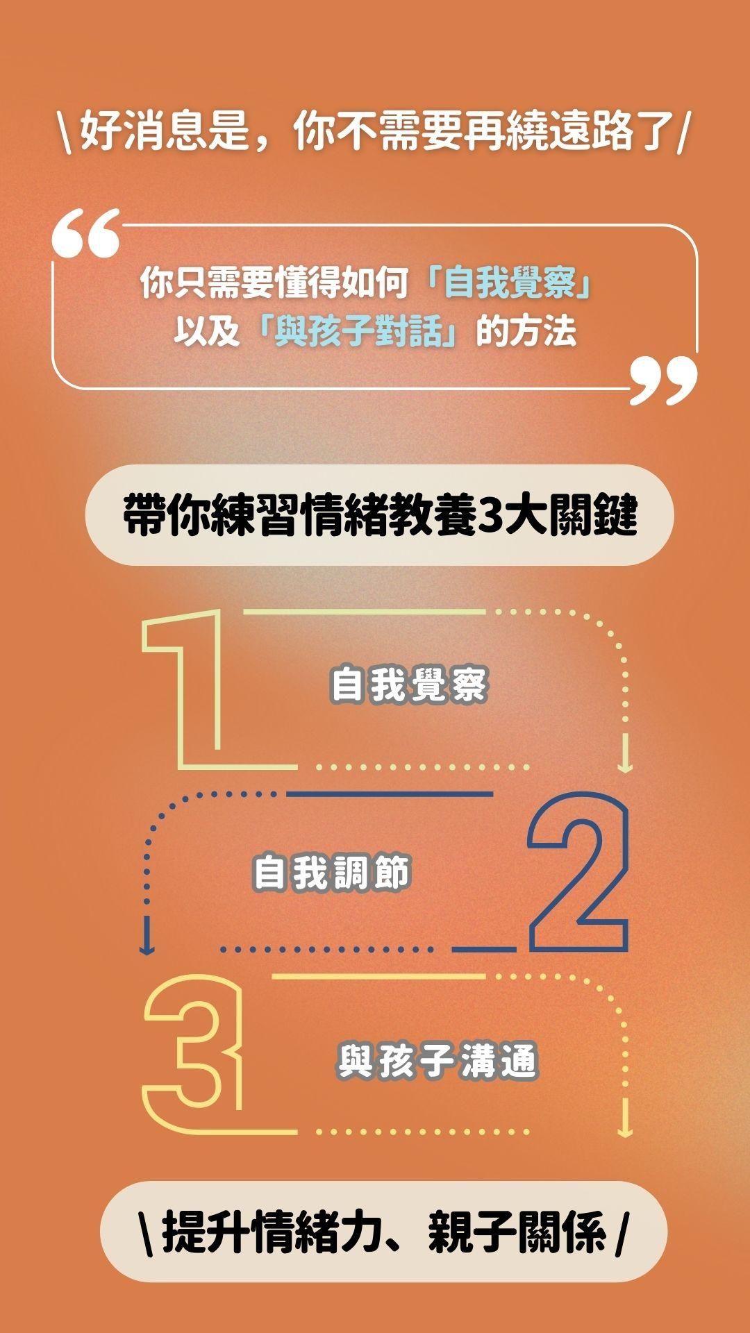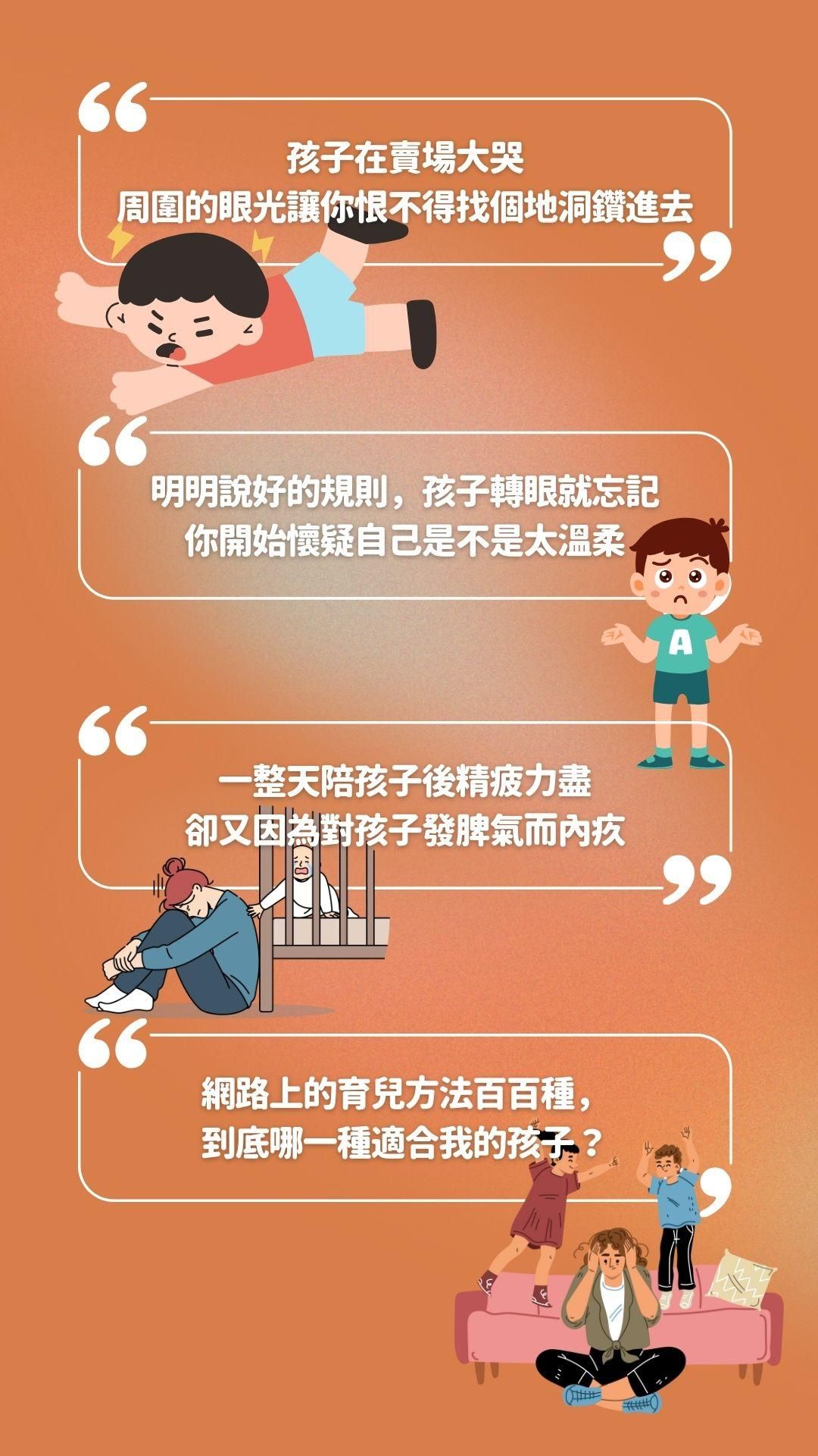 - 【錄播課程】專為父母設計的線上錄播課程,帶領你走過教養最核心的各種學習階段,自我覺察-自我調節-與孩子溝通。